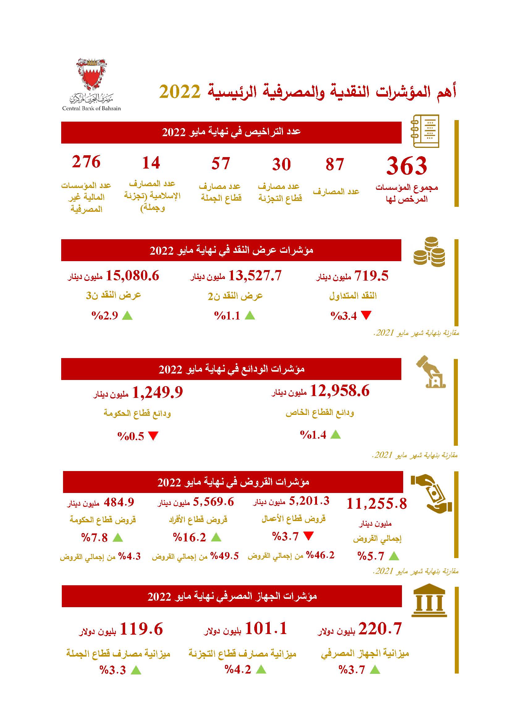 كما اطلع المجلس على أهم التطورات النقدية والمصرفية خلال الأشهر الماضية، فعلى صعيد السيولة المحلية، ارتفعت معدلات السيولة حيث بلغ عرض النقد M3 15.1 بليون دينار في نهاية شهر مايو 2022 بارتفاع بنسبة 2.9% مقارنة بنهاية شهر مايو 2021. وبالنسبة لمصارف قطاع التجزئة فقد ارتفعت ودائع القطاع الخاص في نهاية شهر مايو 2022، حيث بلغت حوالي 13.0 بليون دينار بارتفاع بنسبة 1.4% مقارنة بنهاية شهر مايو 2021. كما ارتفع الرصيد القائم للقروض والتسهيلات الائتمانية المقدمة للقطاعات الاقتصادية المقيمة، حيث بلغ 11.3 بليون دينار في نهاية مايو 2022 بارتفاع بنسبة 5.7% مقارنة بشهر مايو2021، وقد بلغت حصة قطاع الأعمال 46.2% وحصة قطاع الأشخاص 49.5% من مجموع القروض والتسهيلات الائتمانية. وارتفعت الميزانية الموحدة للجهاز المصرفي (مصارف قطاع التجزئة ومصارف قطاع الجملة) إلى 220.7 بليون دولار أمريكي في نهاية مايو 2022، بنسبة 3.7% مقارنة بنهاية مايو 2021.