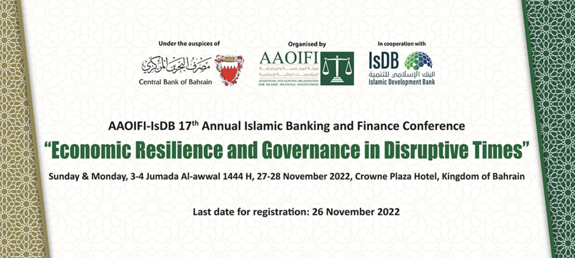 The Accounting and Auditing Organization for Islamic Financial Institutions (AAOIFI) together with the Islamic Development Bank Group (IsDB), represented by IsDB Institute (IsDBI), is set to host the 17th edition of its annual Islamic banking and finance conference under the auspices of the Central Bank of Bahrain. The two-day conference will be held physically at the Crowne Plaza, Kingdom of Bahrain, 27 -28 November 2022, under the theme “Economic Resilience and Governance in Disruptive Times”.