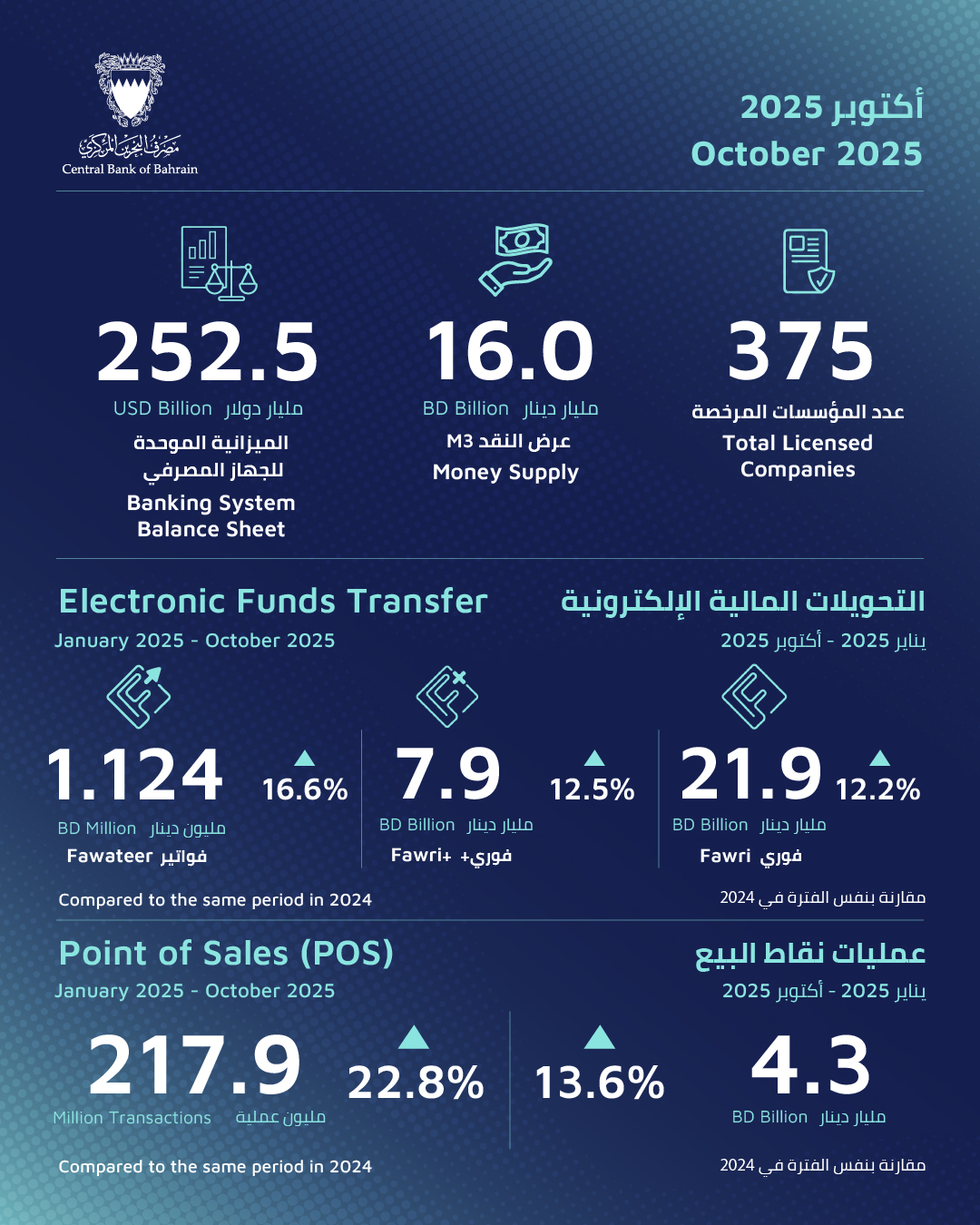 Point of Sales (POS) data for the period January 2025 to October 2025 totaled 217.9 million transactions (77.8% of which were contactless), an increase of 22.8% compared to the same period in 2024. The total value of POS transactions for the period January 2025 to October 2025 totaled BD 4.3 billion (51.8% of which were contactless), an increase of 13.1% compared to the same period in 2024.